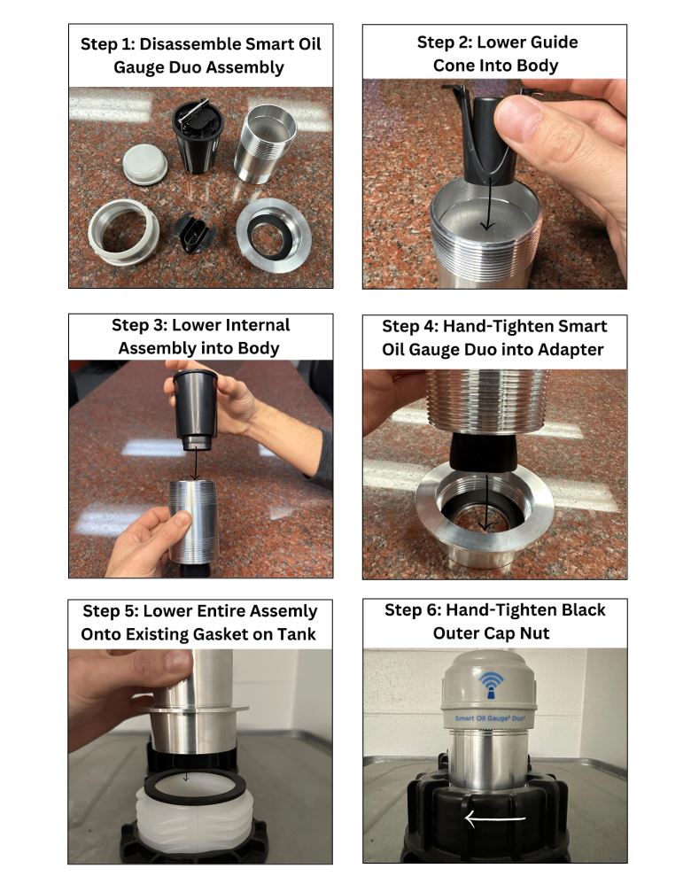 However, if you look at the Duo instructions below, you’ll see that the instructions are slightly different. Pay close attention to steps 2 & 3. This is because the duo requires the insert/guide cone to be slid into the body of the device. This makes it easier for the Smart Oil Gauge to properly send the signal beyond the raised fitting of the Roth tank. DO NOT install the adapter onto the Duo without sliding the guide cone through the metal body of the device.
